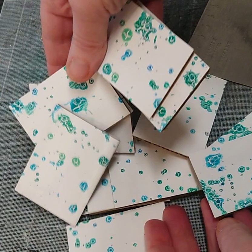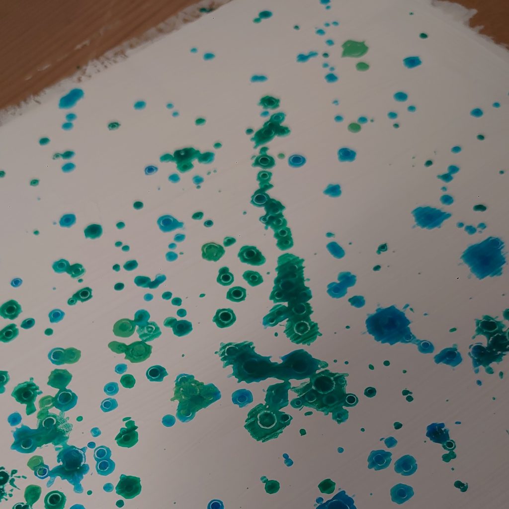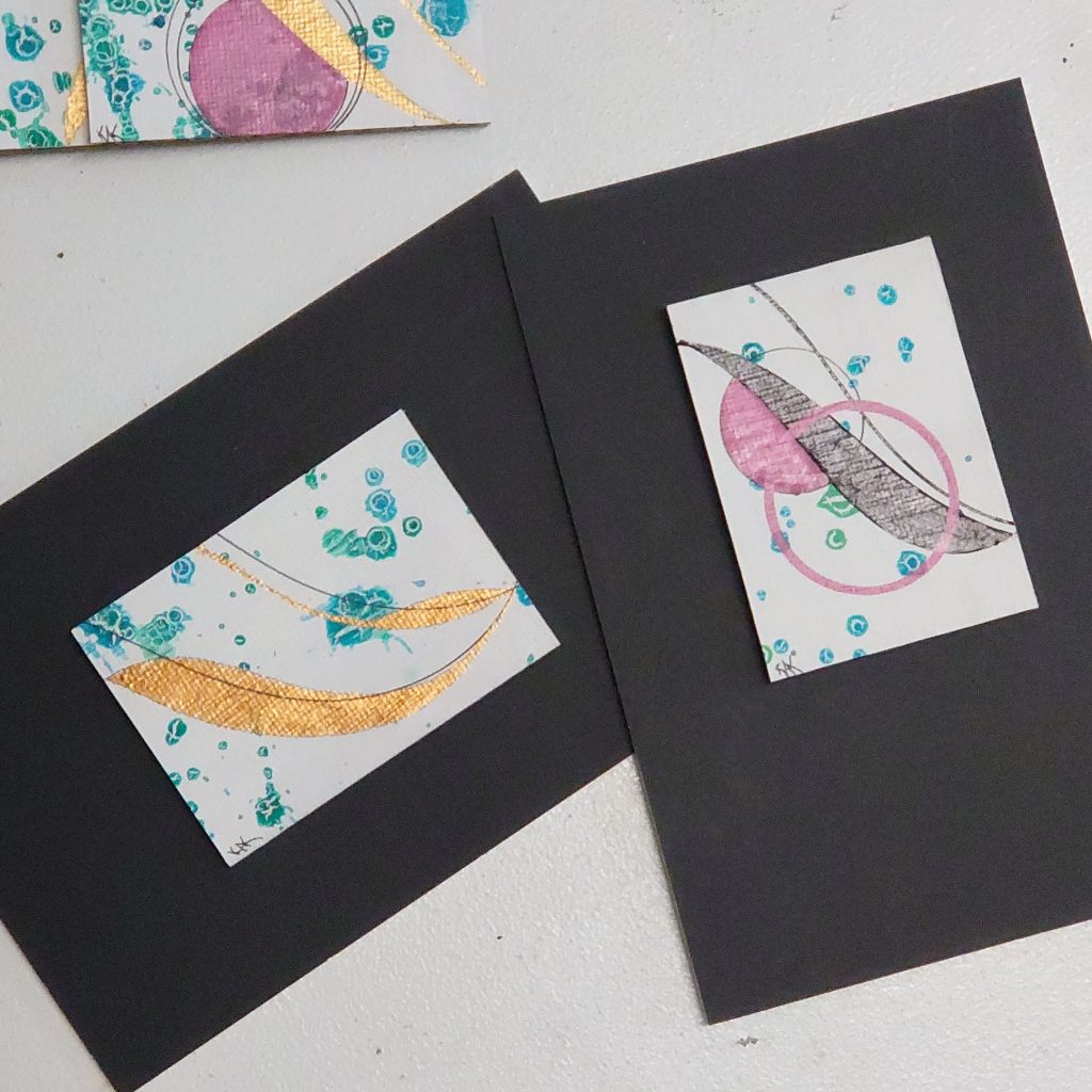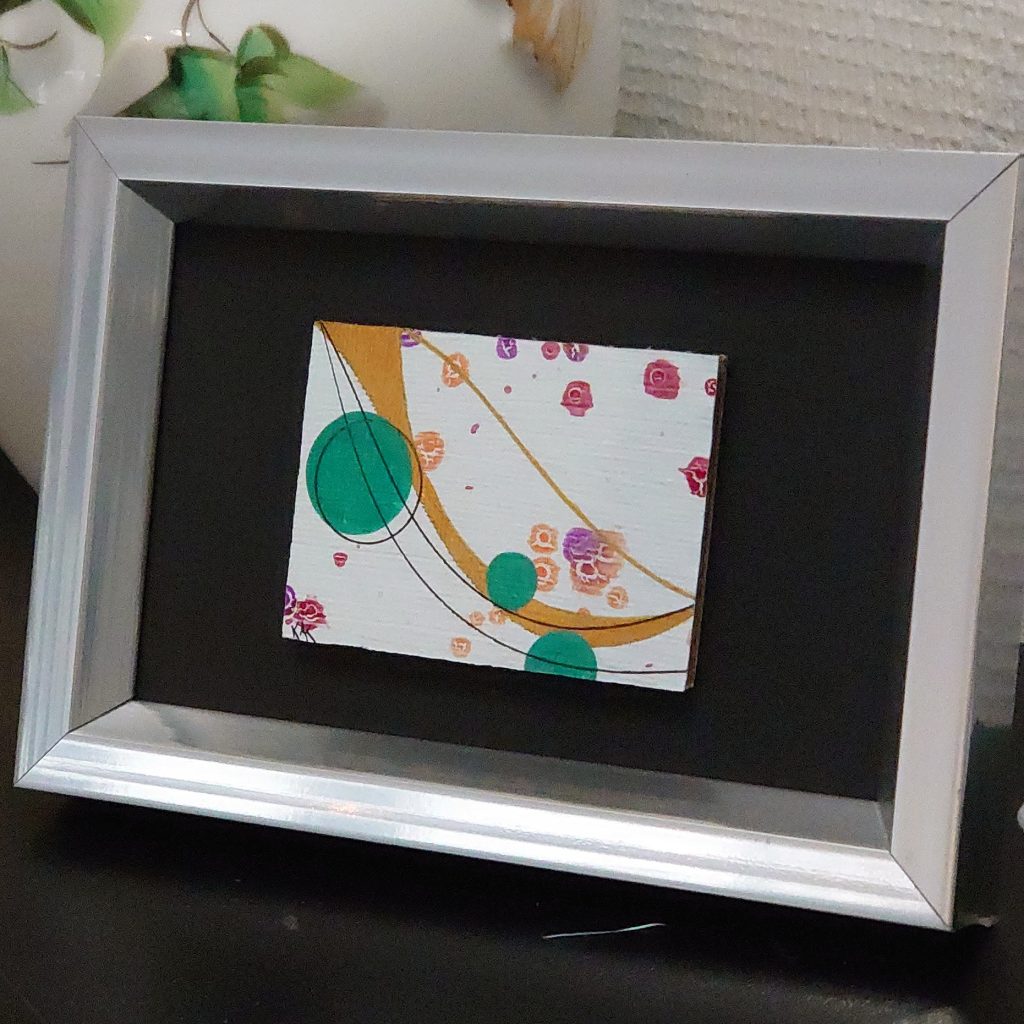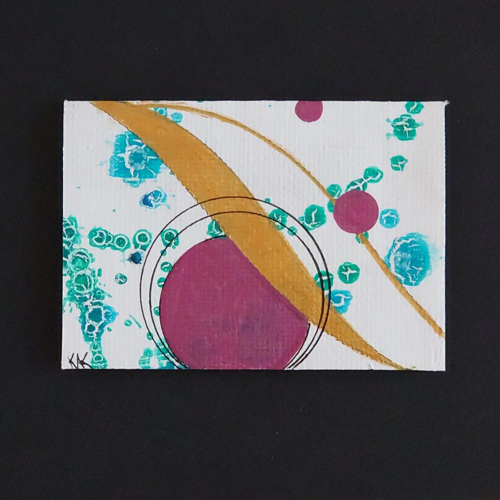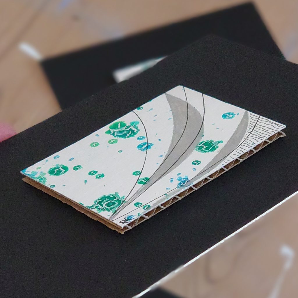 Gaven er et valgfrit mini-kunstværk. Akryl, gouache m.m. på lærred opsat på bølgepap. Og monteret på sort baggrund.